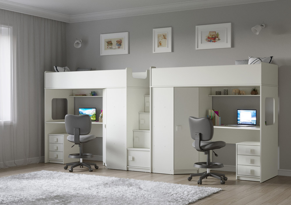Две кровати, два шкафа, две рабочих зоны с тумбами – одна лестница. Идеальный вариант для двоих детей!